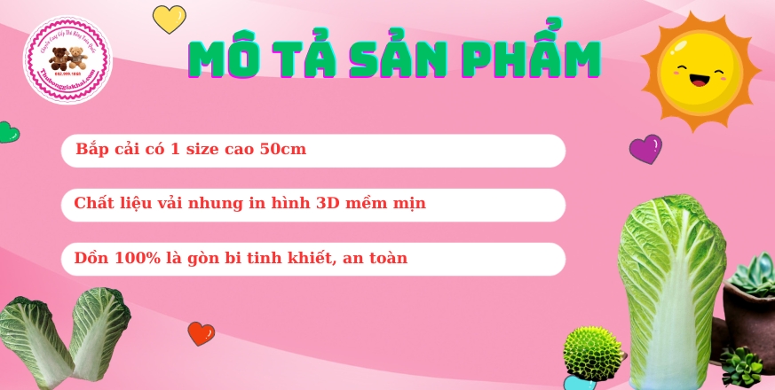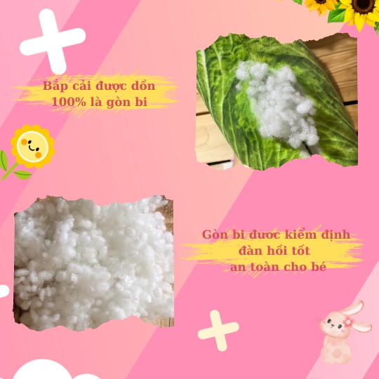 - Thú Nhồi Bông Bắp Cải 3D của shop được gia công trực tiếp tại shop, bên ngoài được làm từ vải nhung in hình 3D mềm mịn, bên trong cam kết nhồi 100% là gòn bi tinh khiết, có độ đàn hồi cực kỳ tốt, không bao giờ bị xẹp khi ôm, đặc biệt an toàn cho cả bé sơ sinh sử dụng.